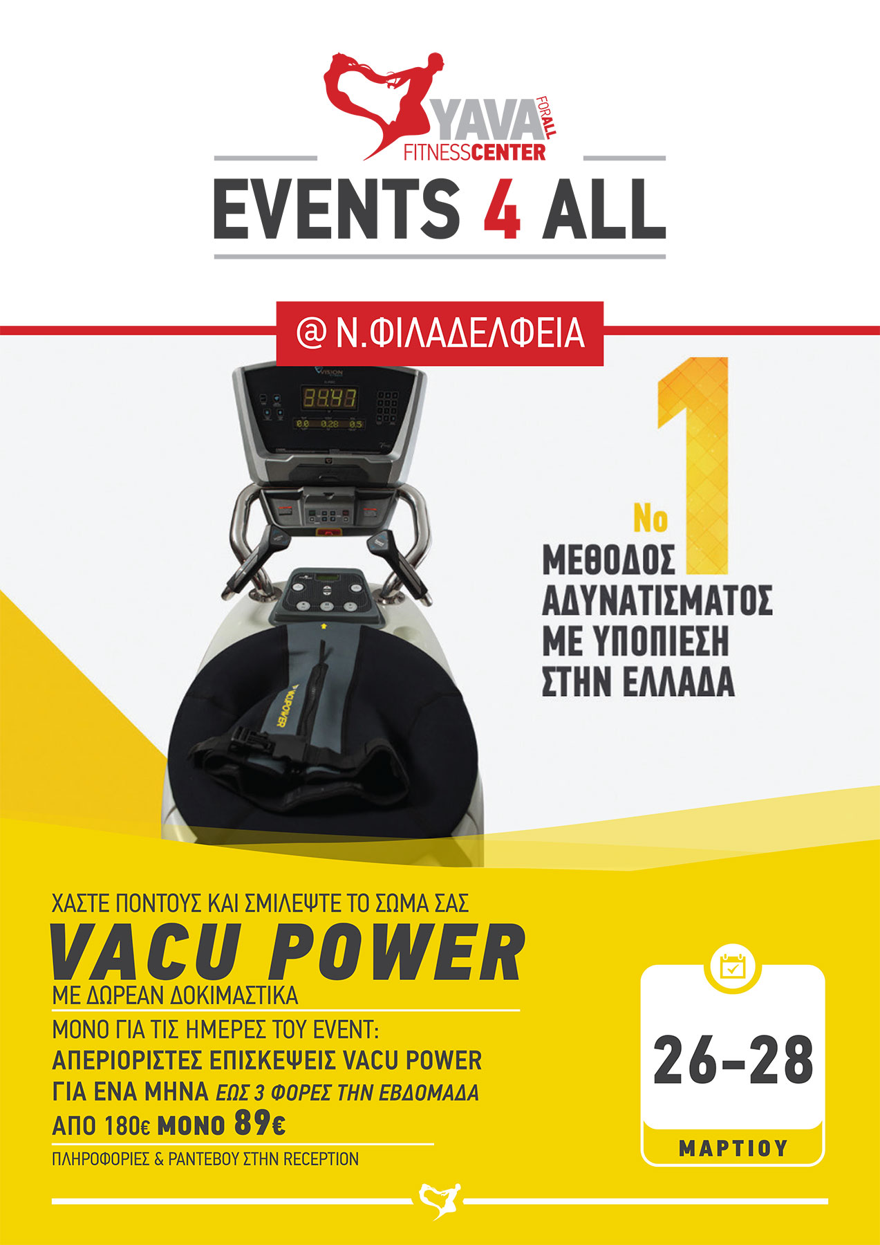 Άλλαξε το σώμα σου στα YAVA Κάτω Τούμπας! Έλα από τις 28 έως τις 30/03 δοκίμασε την μέθοδο αδυνατίσματος με υποπίεση Vacu Power και απόκτησε 12 συνεδρίες και μία λιπομέτρηση, από 190 ευρώ μόνο 59 ευρώ! Μάθε περισσότερα στη reception του γυμναστηρίου! #Yava – It’s not fitness, it’s life! ...