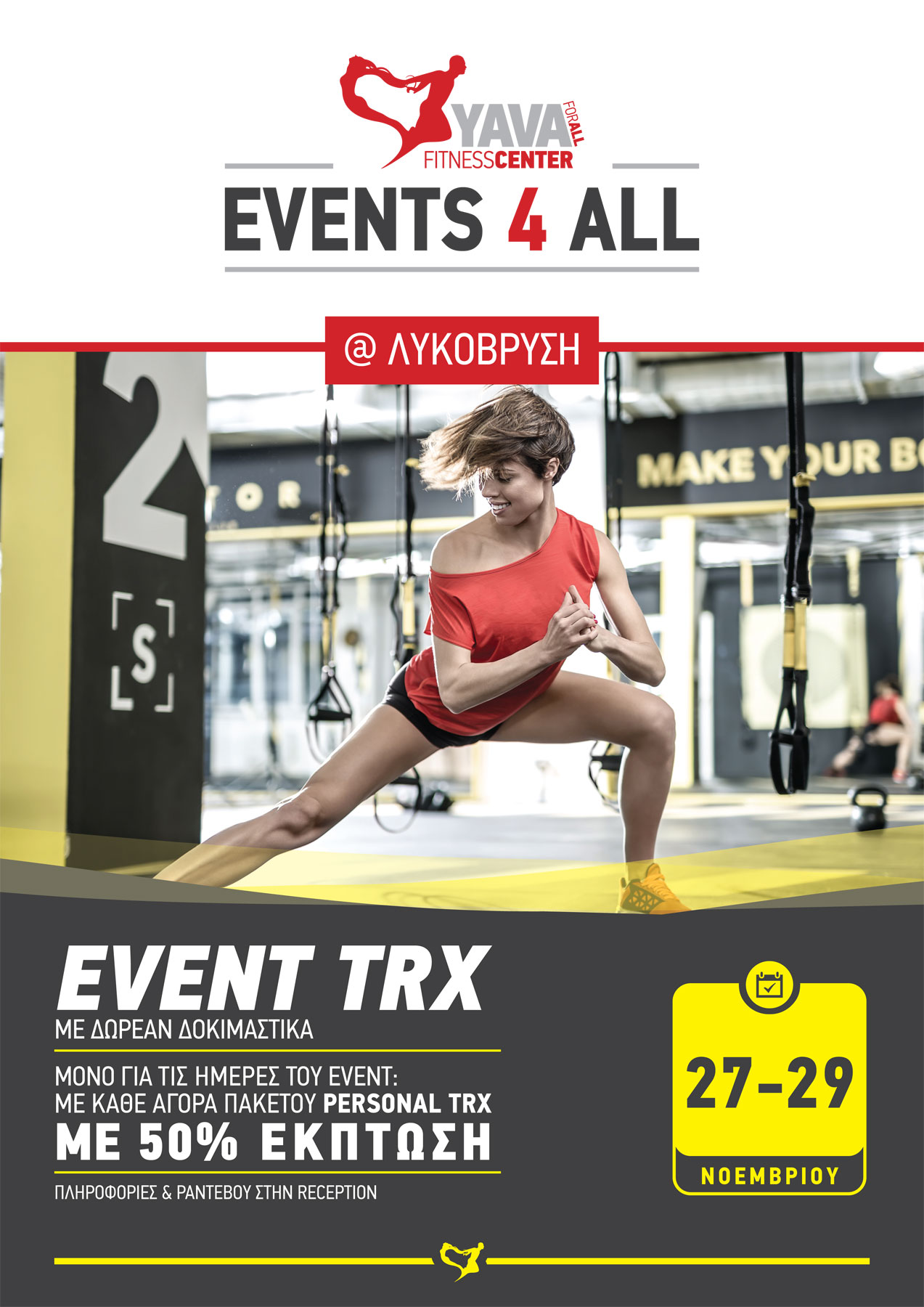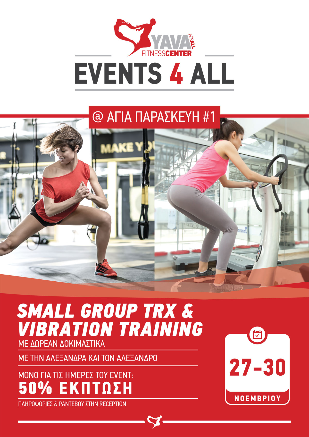 Ανακαλύψτε τα μοναδικά οφέλη του TRX και του Vibration Training στο YAVA Αγία Παρασκευή #1. Σας περιμένουμε για ένα event δωρεάν δοκιμαστικών, από τις 27 - 30 Νοεμβρίου, με τον Αλέξανδρο και την Αλεξάνδρα. Επίσης, και μόνο για της ημέρες του event, επωφεληθείτε της προσφοράς μας...