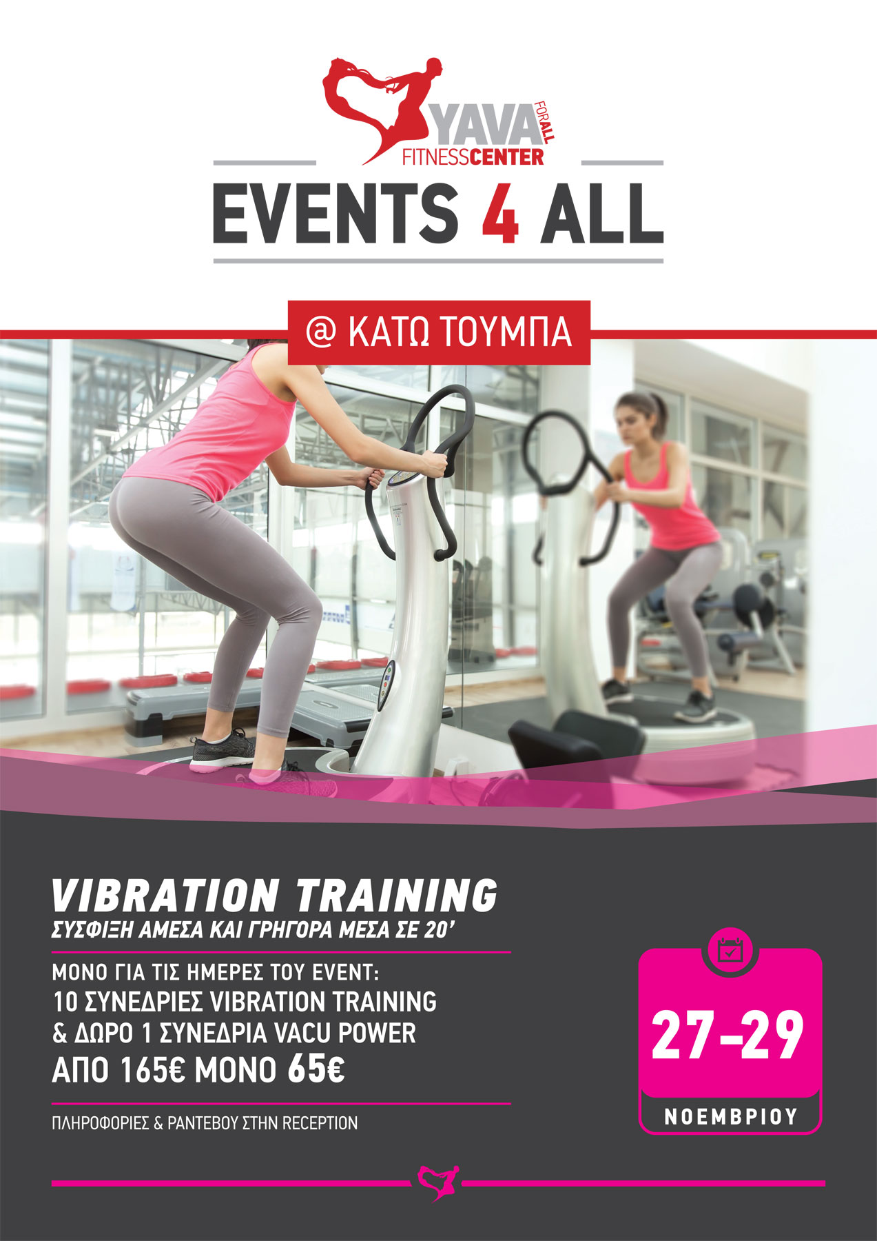 Δοκίμασε και εσύ τη Νο.1 μέθοδο αδυνατίσματος με υποπίεση στην Ελλάδα και πες αντίο στην κυτταρίτιδα! Το YAVA Περιστερίου περιμένει, για δωρεάν δοκιμαστικά στο Vacu Power, όλα τα μέλη και τους φίλους τους, από 27 έως 28 Νοεμβρίου. Πληροφορίες και ραντεβού στη reception. #Yava – It’s not fitness, it’s...