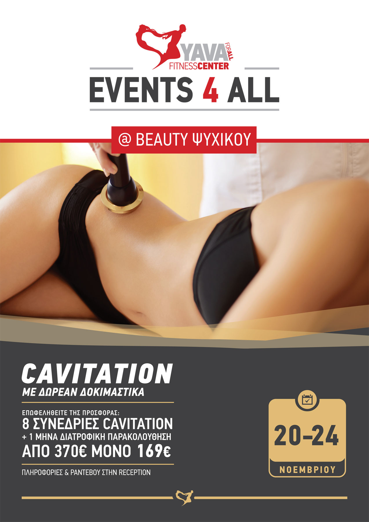 Θέλετε να αντιμετωπίσετε αποτελεσματικά τη κυτταρίτιδα και το τοπικό πάχος; Τότε, χρειάζεστε την τεχνολογία Cavitation RF! Σας περιμένουμε στο YAVA Ν. Ψυχικού για δωρεάν δοκιμαστικά, στο διάστημα 20 - 24 Νοεμβρίου. Επωφεληθείτε και της προσφοράς μας για 8 συνεδρίες Cavitation και ένα μήνα διατροφολογική παρακολούθηση, από 370€...