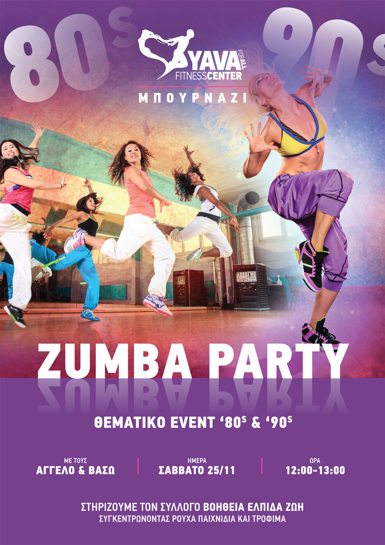 Όταν αναφερόμαστε στα 80's και τα 90's, ένα πράγμα μας έρχεται στο μυαλό: Διασκέδαση στο φουλ! Στο YAVA Μπουρνάζι, στις 25/11 και από τις 12:00 - 13:00, αναβιώνουμε αυτές τις εποχές με ένα μοναδικό Zumba Party! Επιπλέον, μέσα από αυτό το party, στηρίζουμε τον σύλλογο "ΒΟΗΘΕΙΑ...