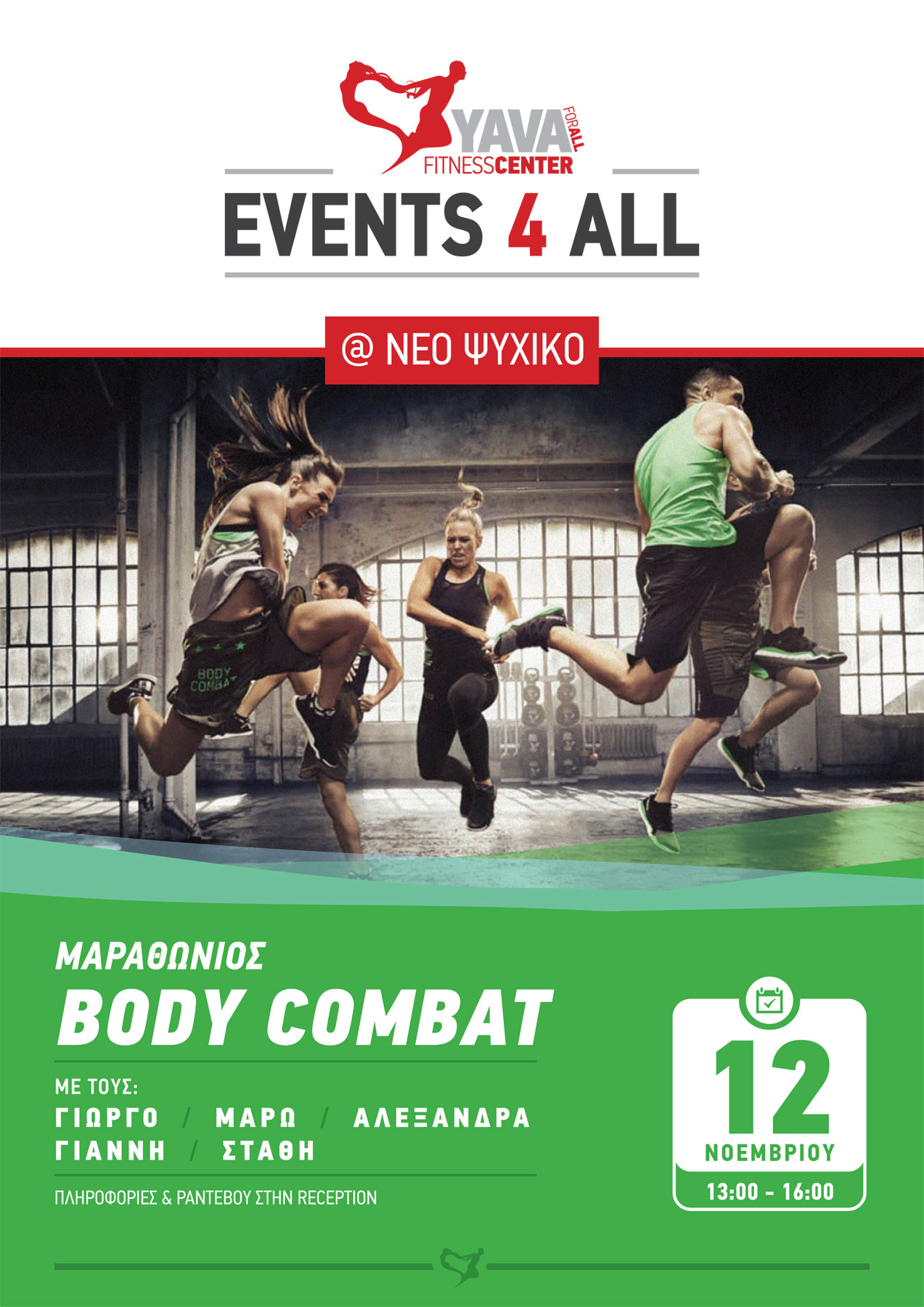 Στις 12 Νοεμβρίου ετοιμαστείτε για καταστάσεις μαραθώνιας μάχης στο YAVA Ν. Ψυχικού με το Body Combat! Εάν είστε λάτρης των πολεμικών τεχνών, τότε δεν πρέπει να χάσετε αυτό το event. Πρόκειται για ένα πολύ δυναμικό πρόγραμμα που θα σας κάνει να κάψετε πάρα πολλές θερμίδες. Μάθετε...