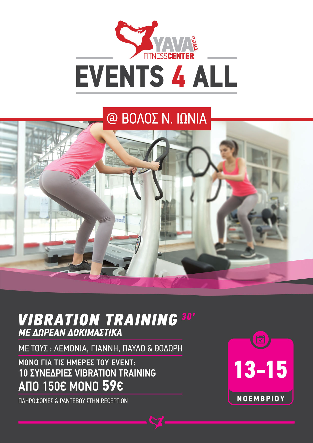 Δωρεάν δοκιμαστικά Vibration Training μέχρι και τις 15 Νοεμβρίου, παρέα με τους trainers μας! Κλείσε τώρα κι εσύ 10 συνεδρίες Vibration Training αξίας 150€, τώρα μόνο με 59€! Η προσφορά ισχύει μόνο για τις ημέρες του event 13-15 Νοεμβρίου. Για περισσότερες πληροφορίες και κρατήσεις, επικοινωνήστε με τη γραμματεία του YAVA Βόλου Ν....